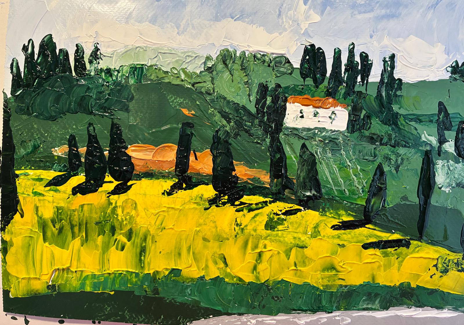 Nella sezione Io studio, paesaggio toscano, acrilico a spatola su carta, 2024