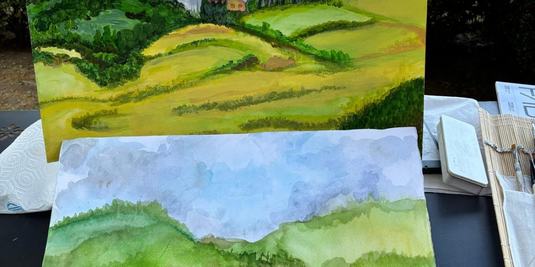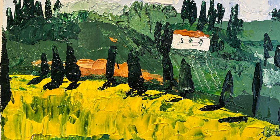 Nella sezione Io studio, paesaggio toscano, acrilico a spatola su carta, 2024